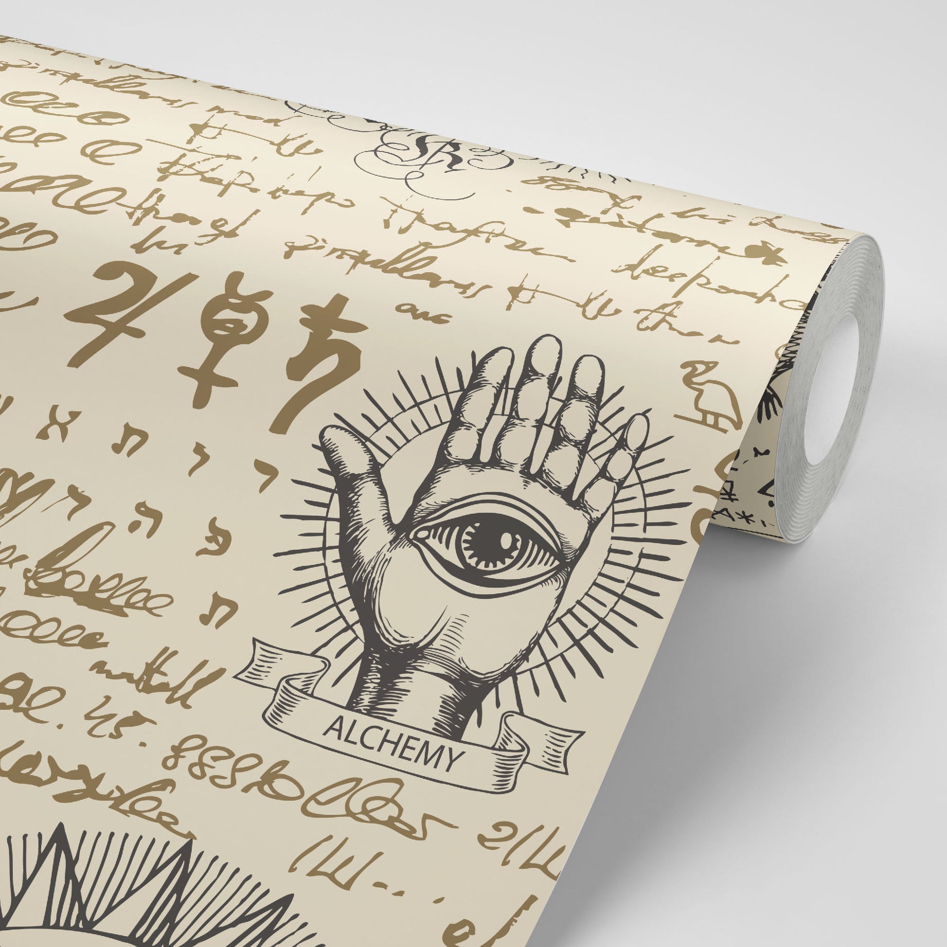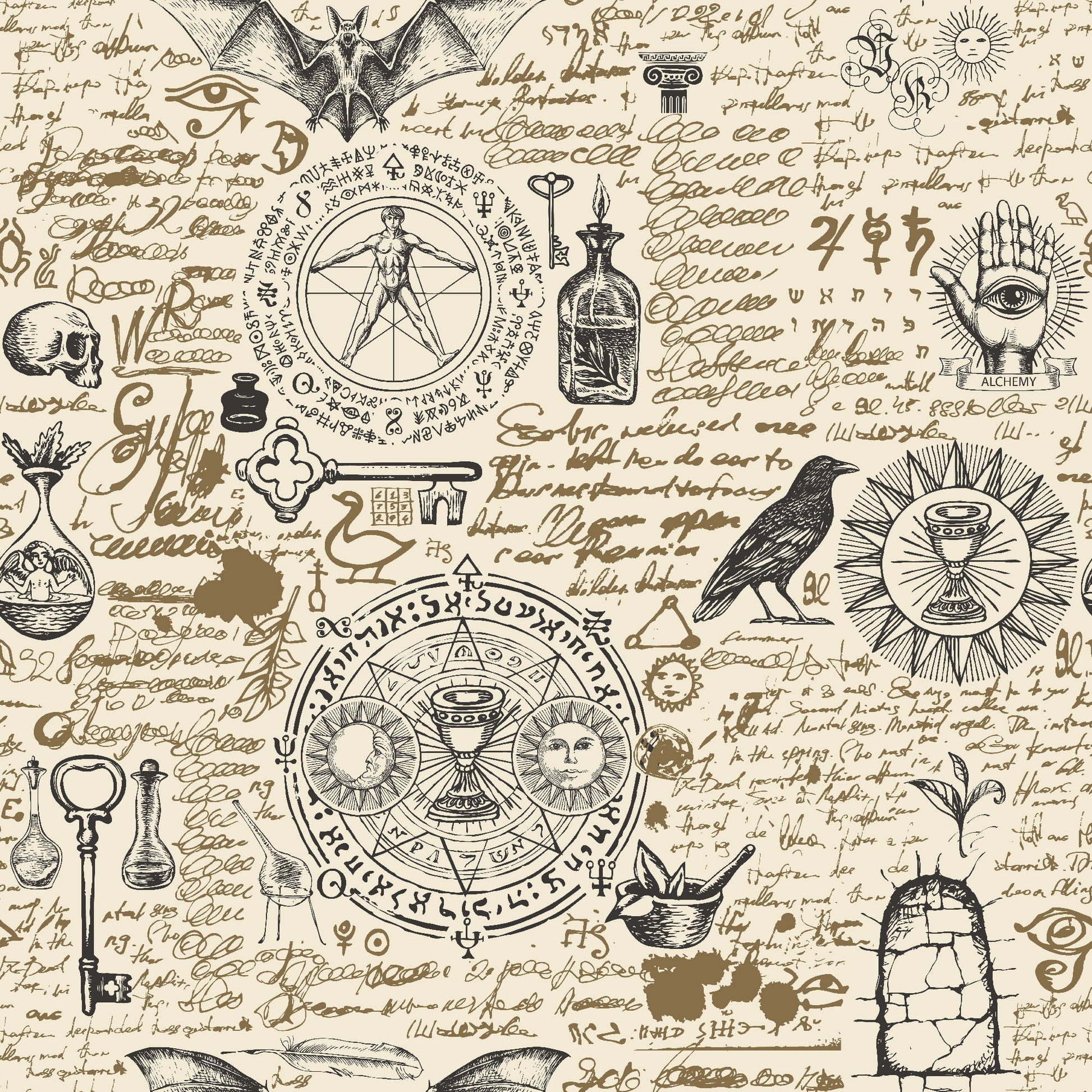 Alchemy is a spellbinding fusion of artistry and mysticism, invoking the spirit of ancient alchemical manuscripts. This captivating wallpaper captures the essence of esoteric knowledge, featuring a palette dominated by neutral tones with hints of ochre and showcasing meticulously detailed handwritten scribbles and drawings.