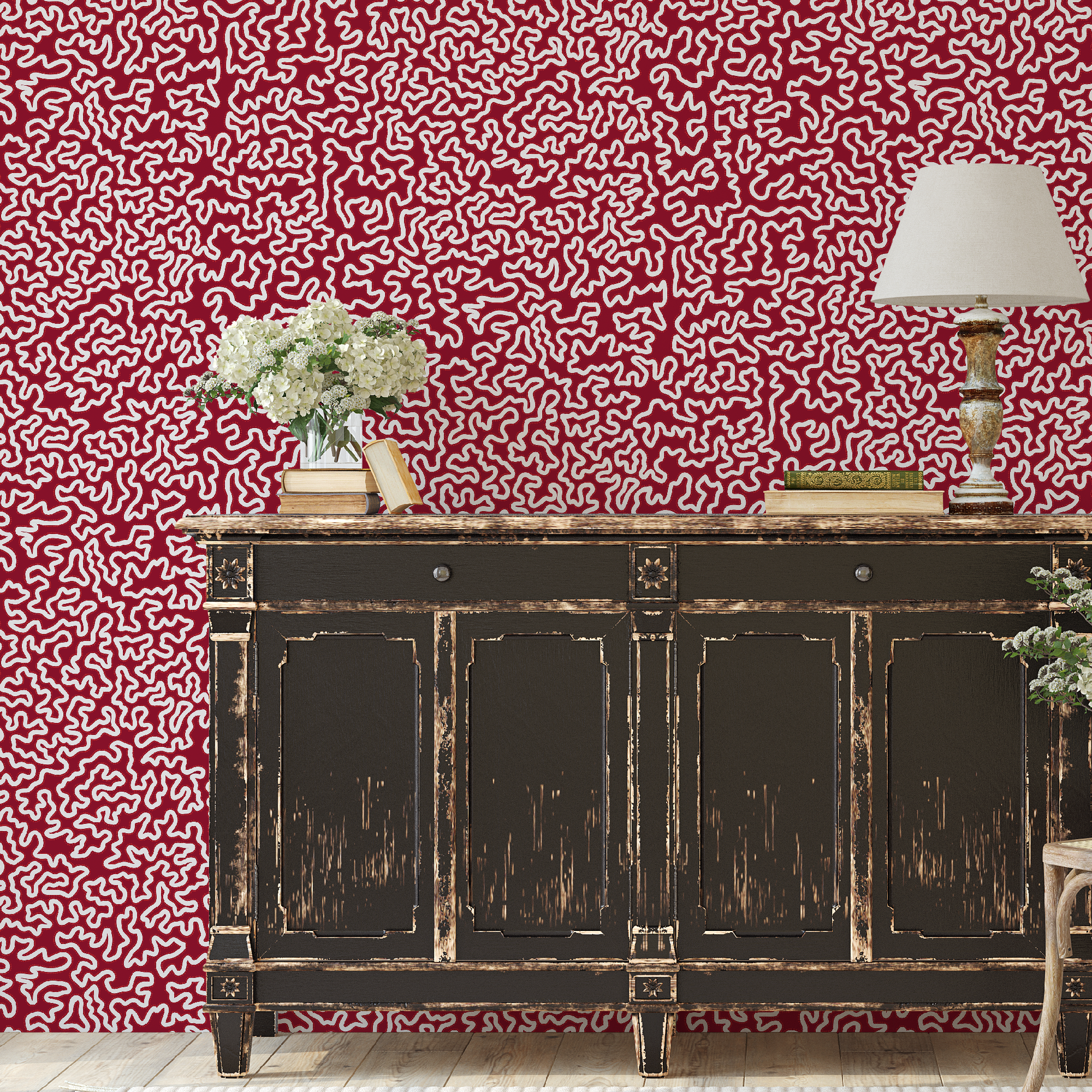 Dive into sophistication with our Nightcrawler pattern, with a deep wine rose backdrop adorned by a striking white vermicular pattern. Delicate blush coral dots dance across the design, adding a touch of whimsy to its timeless charm.