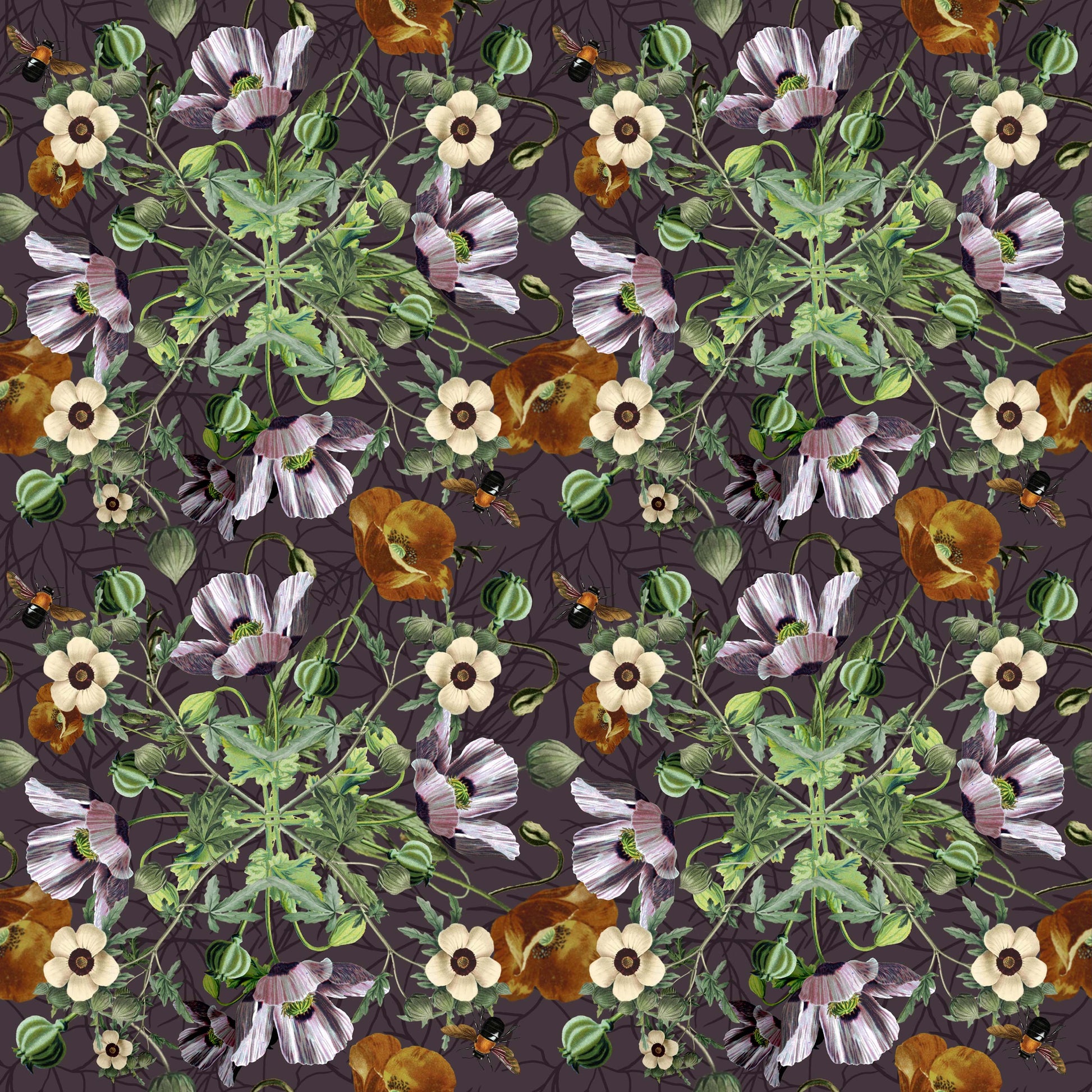 Midnight Garden Opium partners a grid of poppy species with honeybees. This intricate pattern of rich jewel tones is sure to evoke feelings of relaxation and beauty.