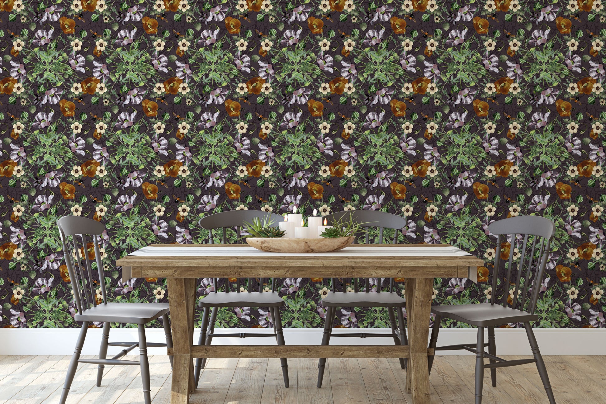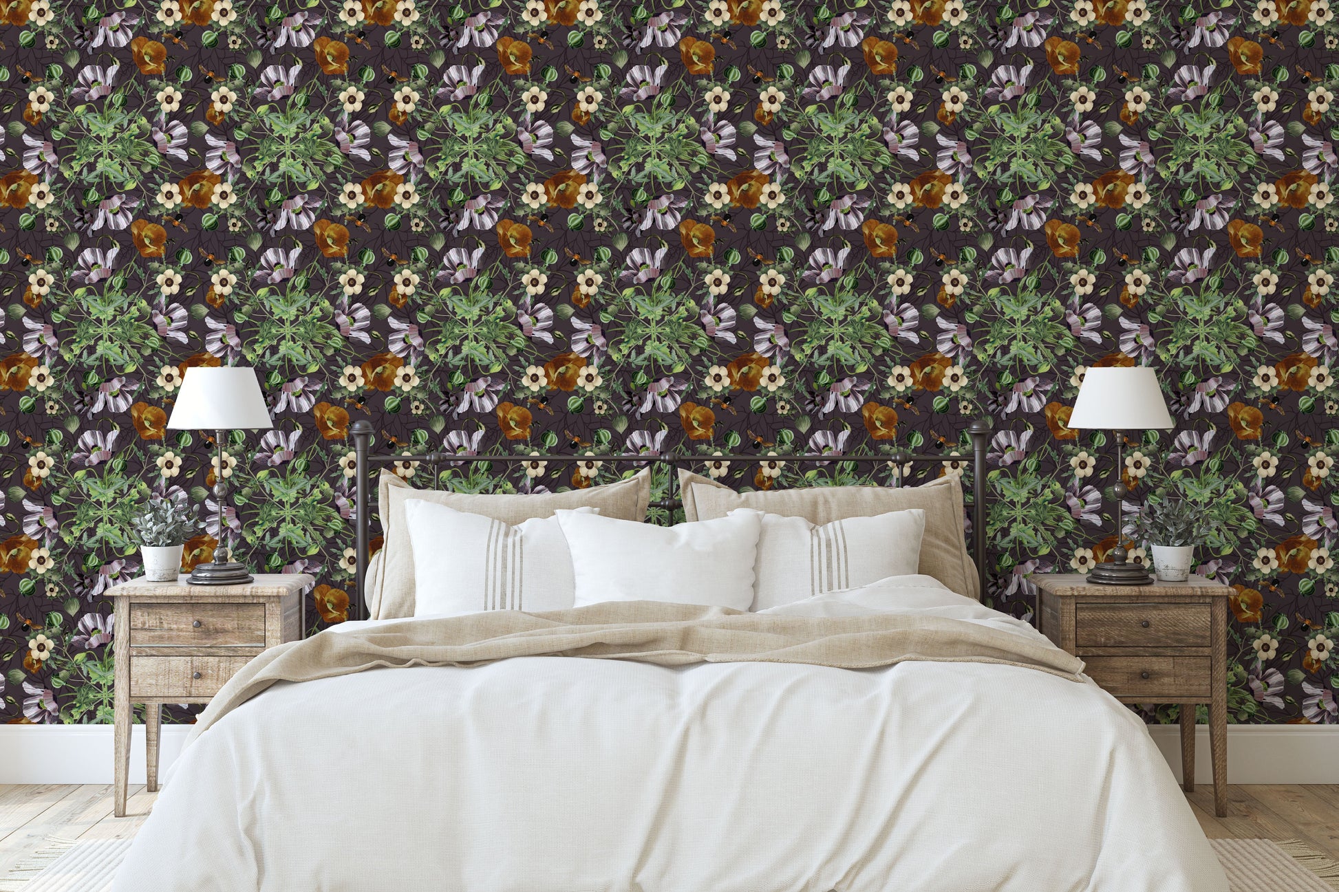 Midnight Garden Opium partners a grid of poppy species with honeybees. This intricate pattern of rich jewel tones is sure to evoke feelings of relaxation and beauty.