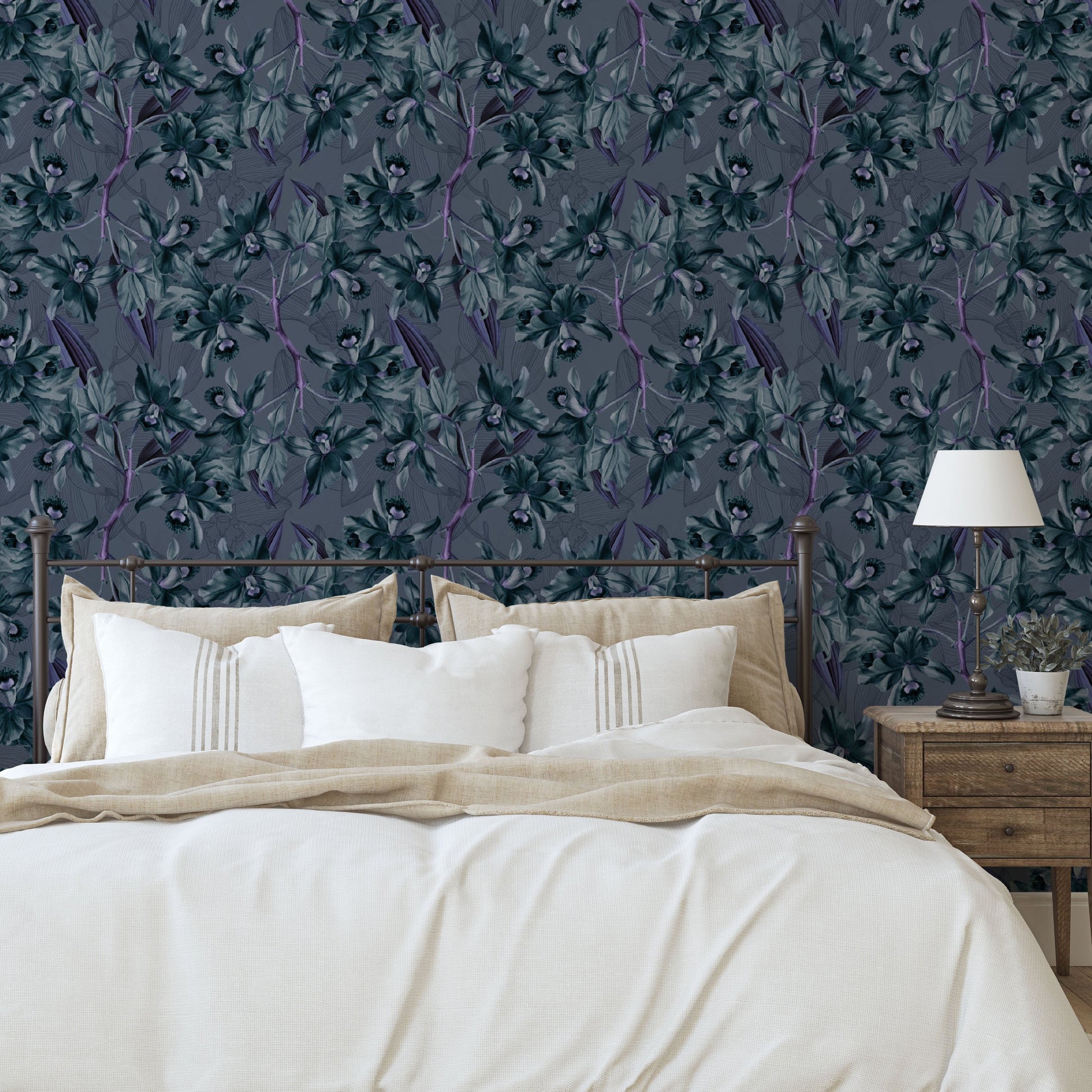 Tropic Orchid showers deep blue blooms over a backdrop of black orchid outlines for a more subdued tropical feel. This lush print will bring a stunning and sophisticated style to your space, making it the perfect addition to any home.