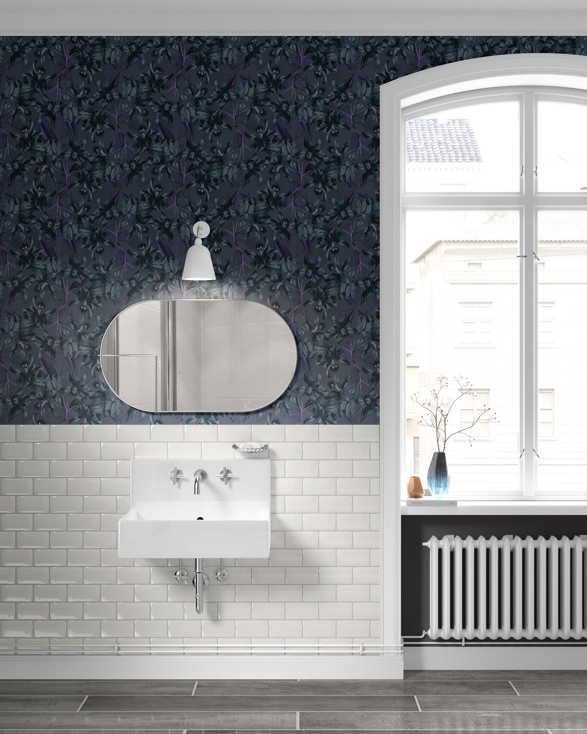 Tropic Orchid showers deep blue blooms over a backdrop of black orchid outlines for a more subdued tropical feel. This lush print will bring a stunning and sophisticated style to your space, making it the perfect addition to any home.