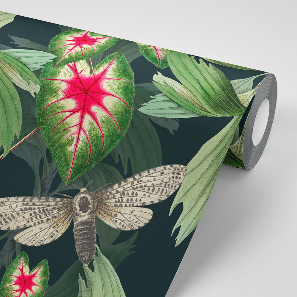 Tropic Palm showcases highly patterned butterflies against a linear palm print. This modern design is perfect for making a bold visual statement, while bringing a touch of the exotic right into your living space.