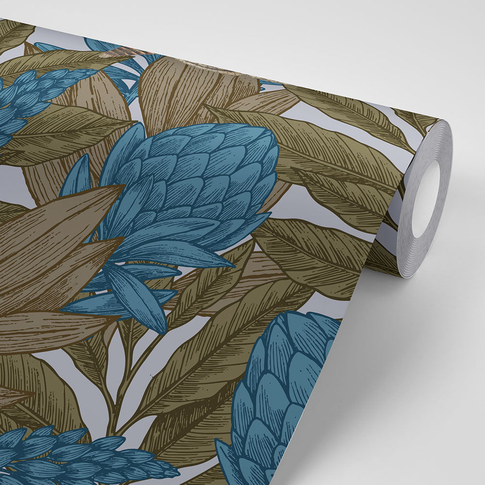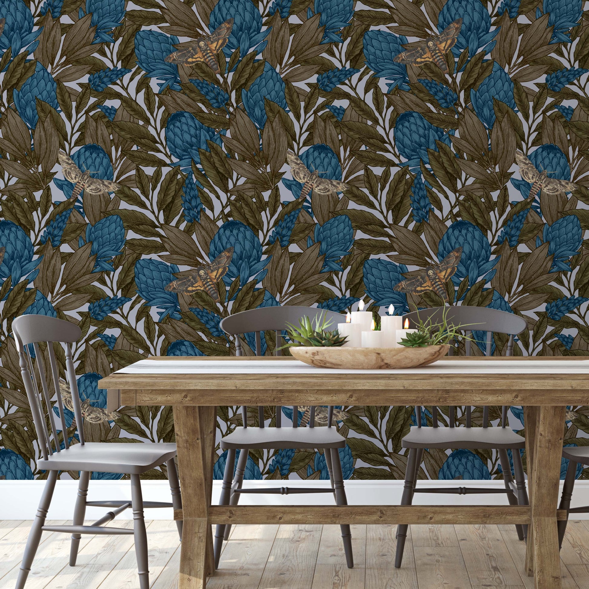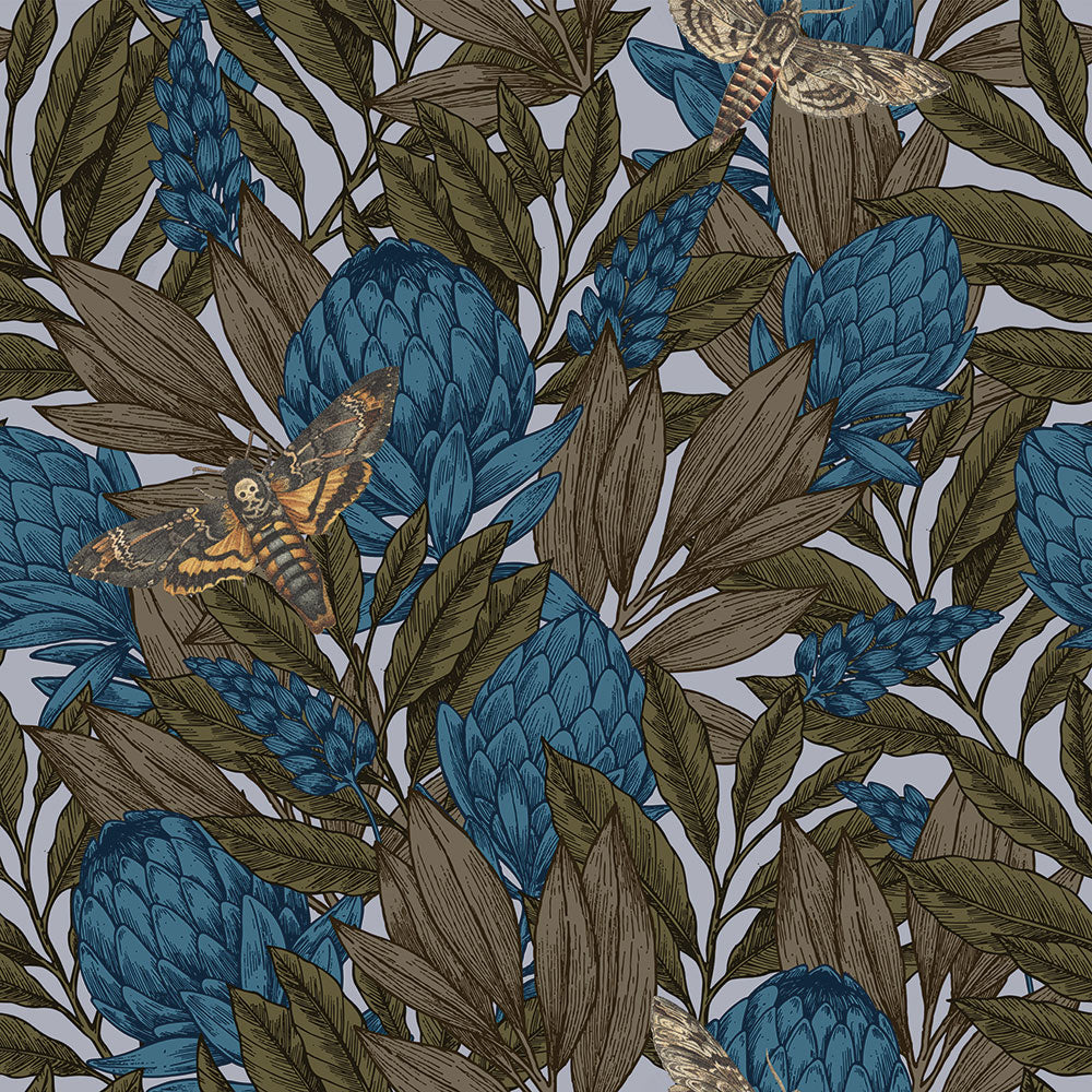 Midnight Garden Protea combines these architectural flowers with the moths that feast upon them. This unique pattern evokes a sense of mystery and captures the beauty of an unfamiliar natural world, adding an element of sophistication to any room.
