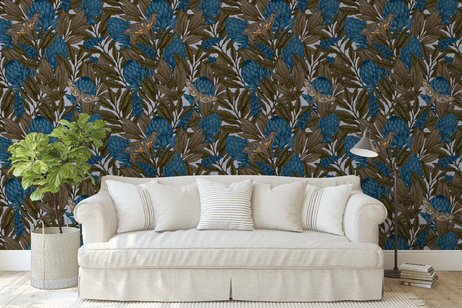 Midnight Garden Protea combines these architectural flowers with the moths that feast upon them. This unique pattern evokes a sense of mystery and captures the beauty of an unfamiliar natural world, adding an element of sophistication to any room.