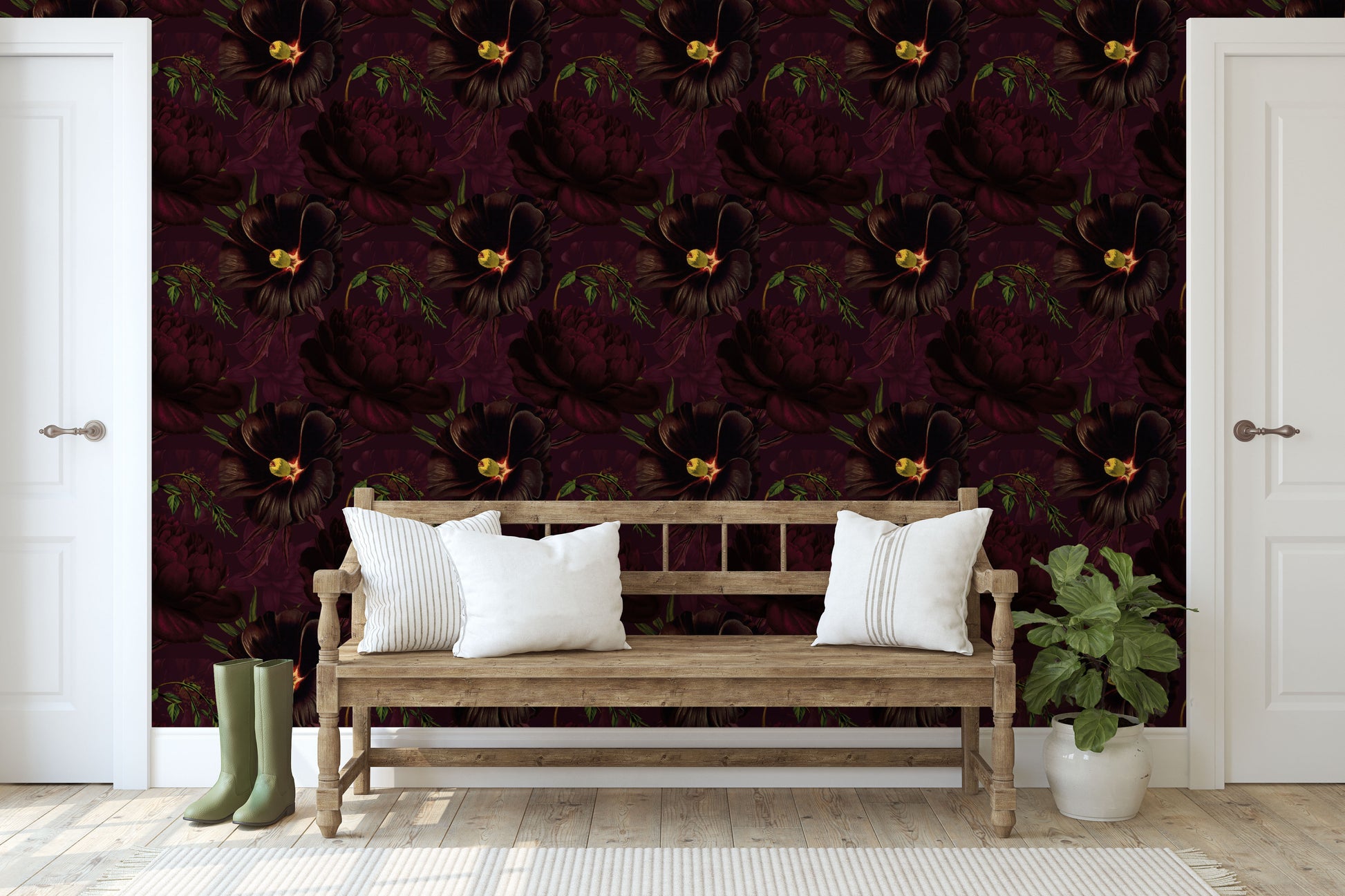 Vintage Floral Rouge with dahlias in rich crimson adds drama to your most intimate of spaces. A softly glowing palette of red shades that blend together for a romantic, timeless feel.